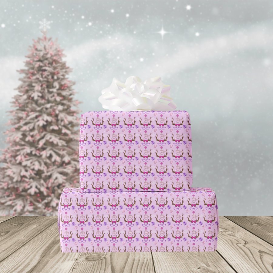Pink, girly reindeer pattern is a mix design that includes reindeer antlers with pink bow, pink nose, purple glasses, brown coffee cup, purple gift, and swirly treat. An adorable pattern.Pink Girly Reindeer Pattern Cute Mix Wrapping Paper